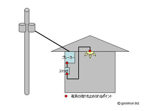 電気の作業をするにあたり、電流を止められるポイントは上図の通りです。